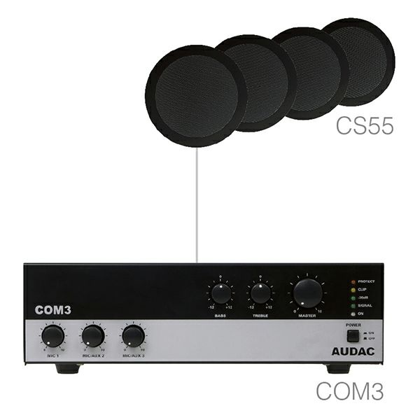 - COM 3, razglasno 100V pojacalo (30W RMS snage, izlazni napon/impedancija: 100V,70V,25V/4Ohm, frekvencijski raspon: 80Hz-18kHz)