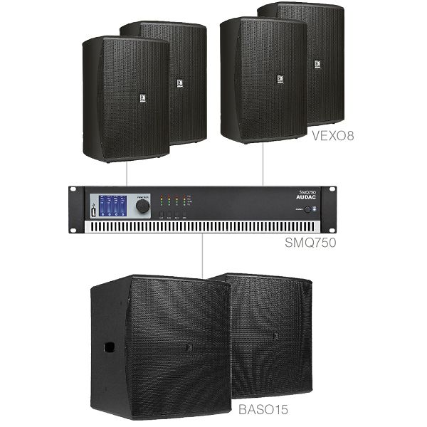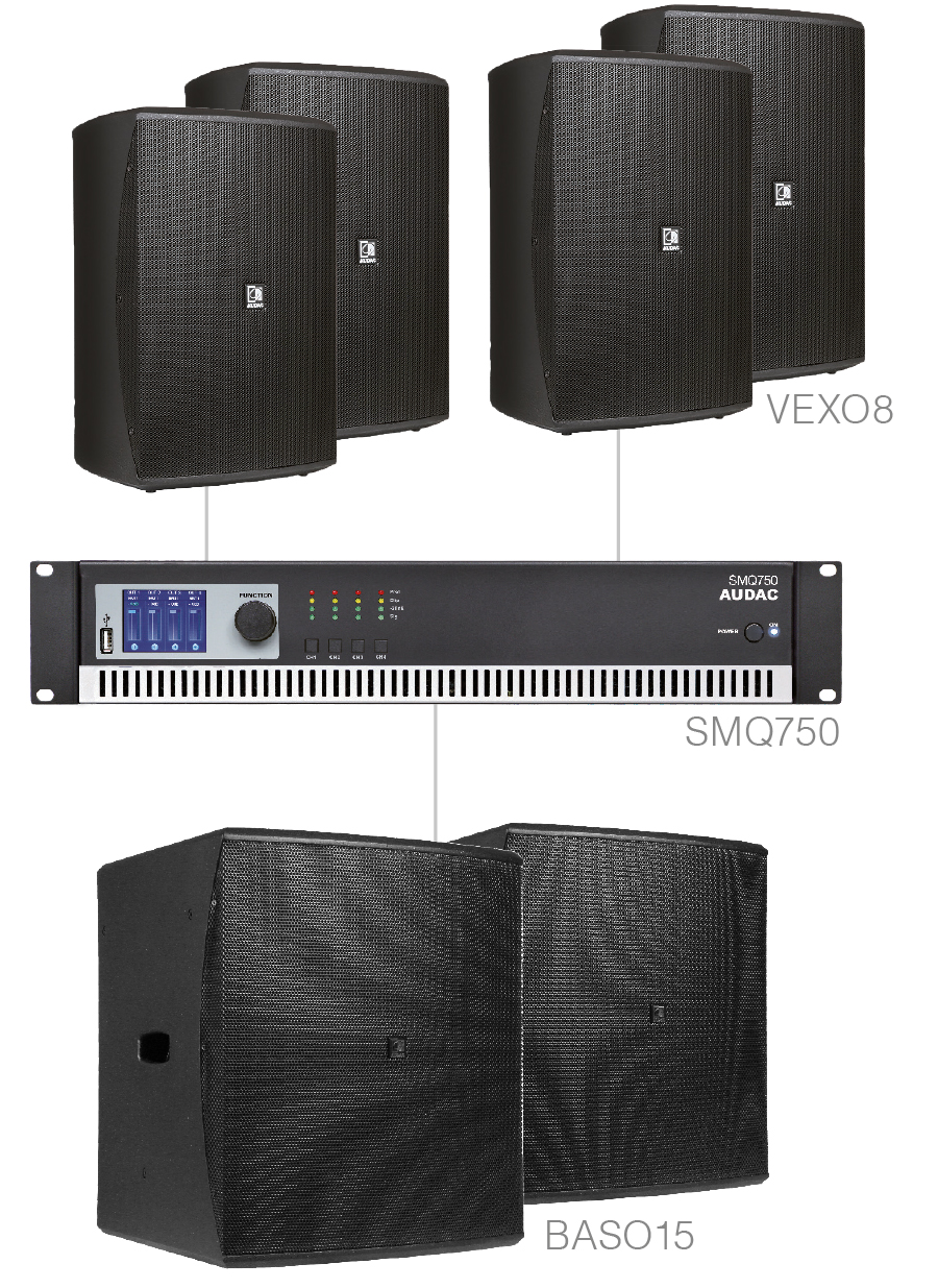 - SMQ 750, 4-kanalno pojacalo snage (4x750W, frekvencijski raspon: 20Hz-20kHz, RS-232 kontrola i USB konfiguracija, LCD zaslon)