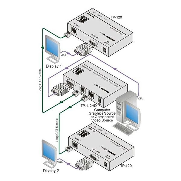 je video odašiljac koji pretvara VGA ili HDTV signal na 15 pinskom HD konektoru i šalje do prijemnika putem cat.6. Maksimalna rezolucija WUXGA ili 1080p.